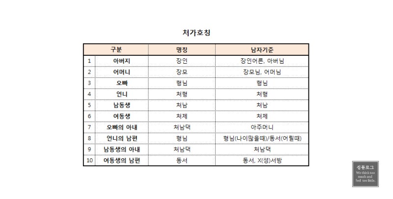 장인, 장모, 처제, 매형 같은 누구나 아는 호칭을 제외하고 최대한 애매한 호징만 모아봤습니다. ^^ 처가 호칭